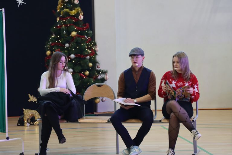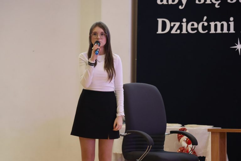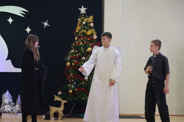 Pełna dobra, miłości i przyjaźni atmosfera świąt Bożego Narodzenia zagościła w naszej szkole już 19 grudnia. W tym dniu społeczność szkolna zgromadziła się na sali gimnastycznej na wspólnym spotkaniu, by w refleksyjnym nastroju oddać się magii Świąt. Na początku Pani Dyrektor Agnieszka Prędota-Gad powitała wszystkich zebranych i wyraziła szczególną radość z obecności Księdza Dziekana Karola Stacha, przedstawicielek Rady Rodziców oraz emerytowanych nauczycieli. Następnie odbyła się część artystyczna. Dzięki wzruszającym słowom przeplatanych dźwiękami najpiękniejszych kolęd i świątecznych piosenek w wykonaniu naszej młodzieży, publiczność została wprowadzona w atmosferę zadumy nad przesłaniem nadchodzących Świąt i wartości dobra oraz pokoju. Przedstawienie, które skupiało się na metafizyce codzienności, poruszało temat najważniejszych spraw ludzkiego życia: zdrowia, miłości, szacunku, pomocy. Wszak maleńka Miłość, która rodzi się w betlejemską, cichą noc, rodzi się i w nas w każdym dobrym słowie i czynie darowanym drugiemu człowiekowi. Wzruszającym akcentem podkreślającym tę prawdę było wspólne dzielenie się opłatkiem: na pozór kruchym, cichym, pokornym znakiem, a jednak o ogromnej mocy miłości i jedności.