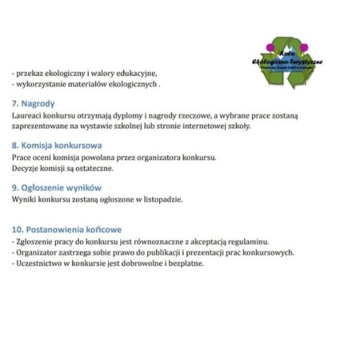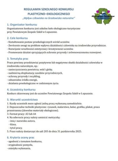 Zachęcamy wszystkich uczniów PZS w Łopusznie do wzięcia udziału w konkursie plastycznym organizowanym przez szkolne koło ekologiczno-turystyczne. Poniżej przedstawiamy regulamin konkursu.